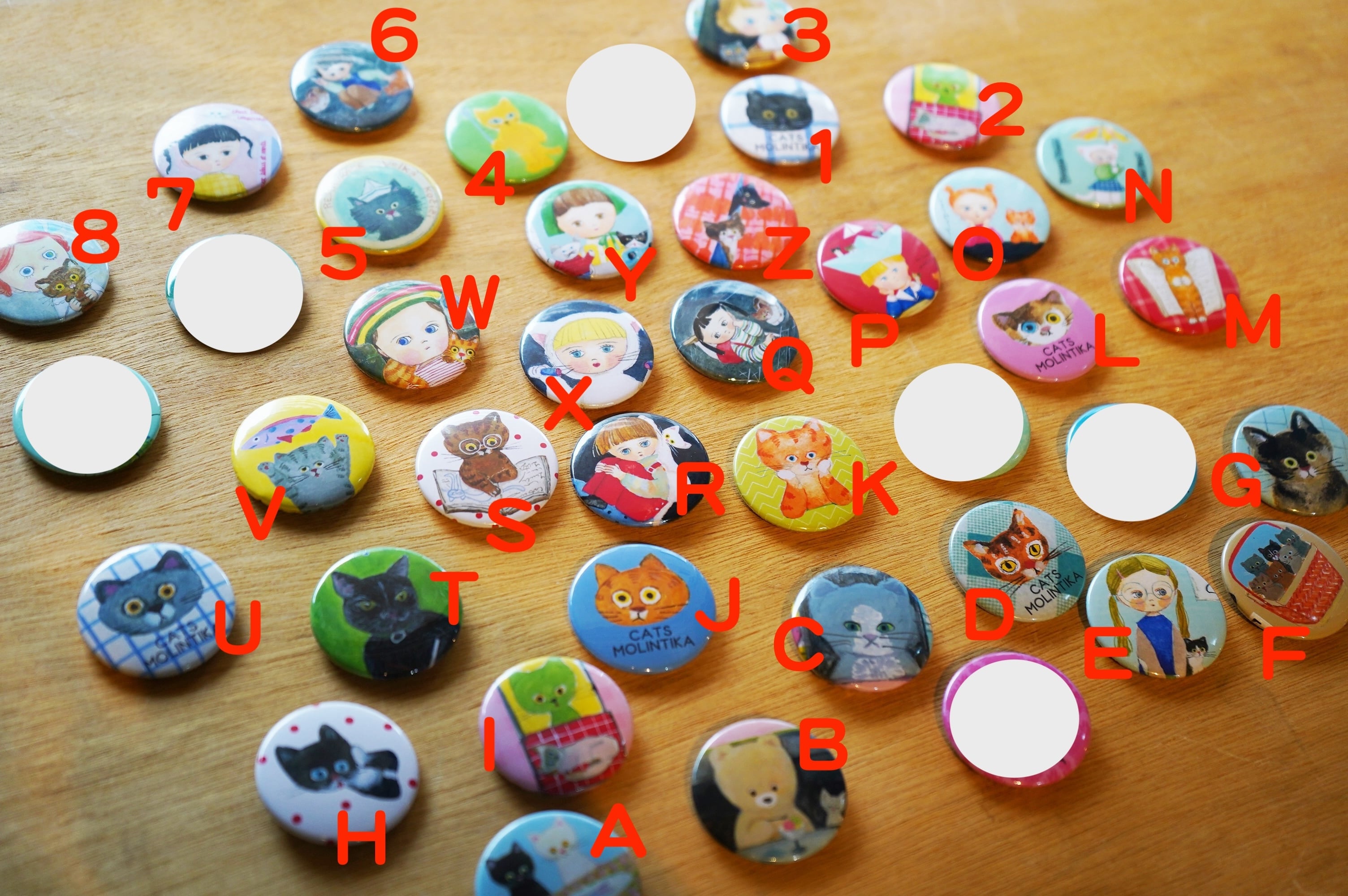 marini*monteany 缶バッジ 1種類づつしかないものもあります。 猫イラストばかり集めた缶バッジ。 お気に入りの猫いませんか?